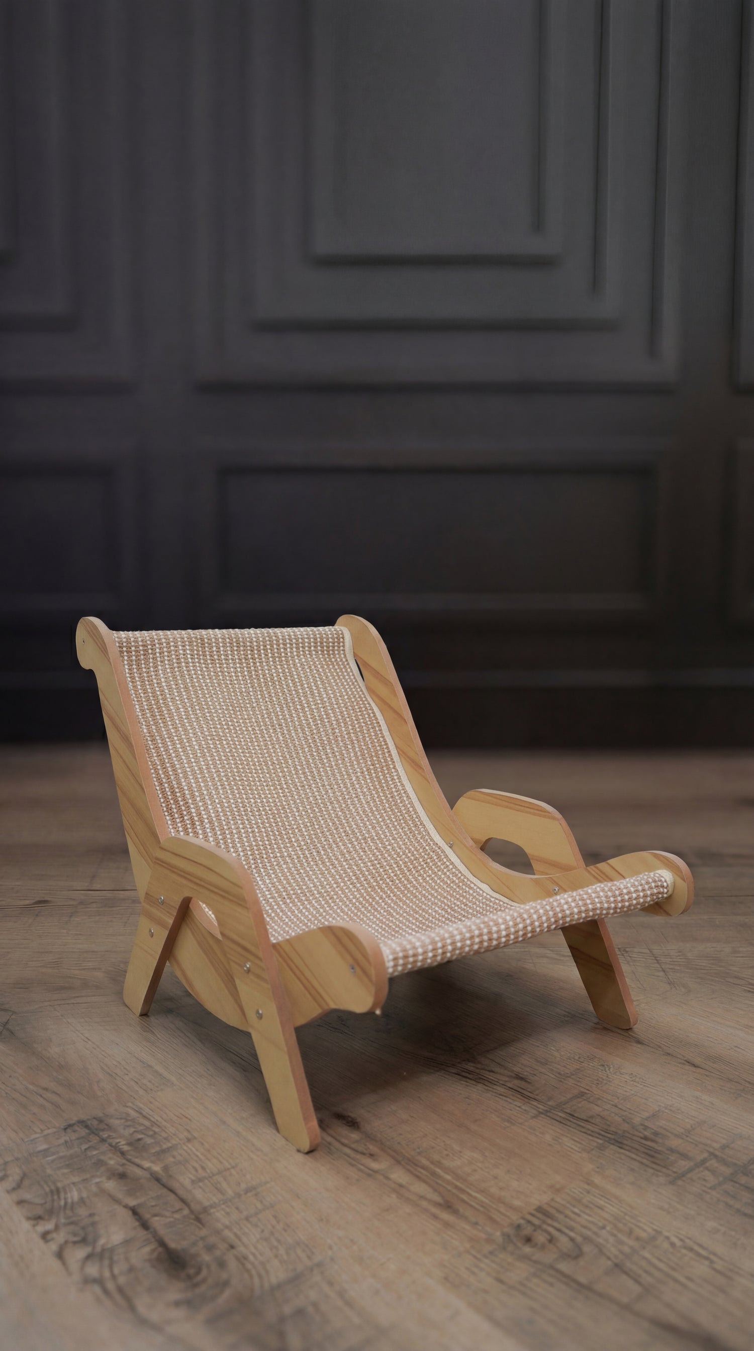 A minimalist cat lounge that combines a comfortable resting chair with a built-in scratch surface. Designed with a solid wood frame and durable linen rope, it supports daily lounging and scratching while blending naturally into modern interiors.