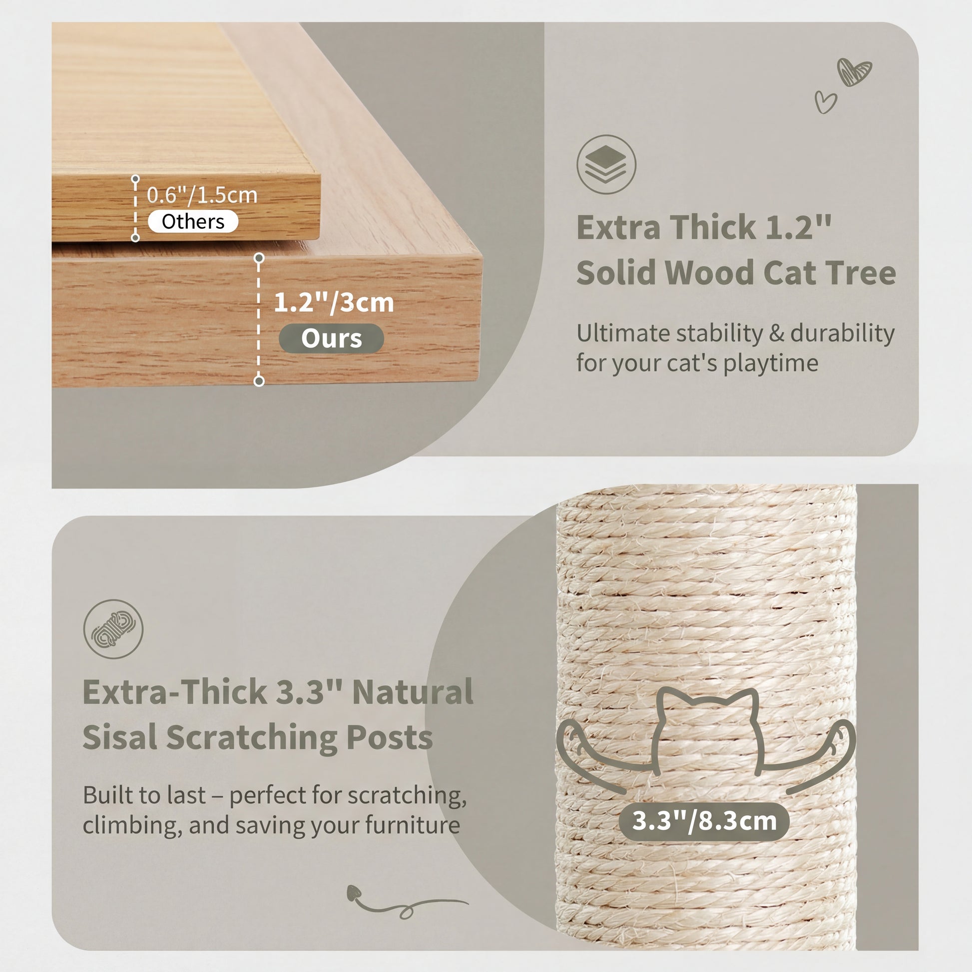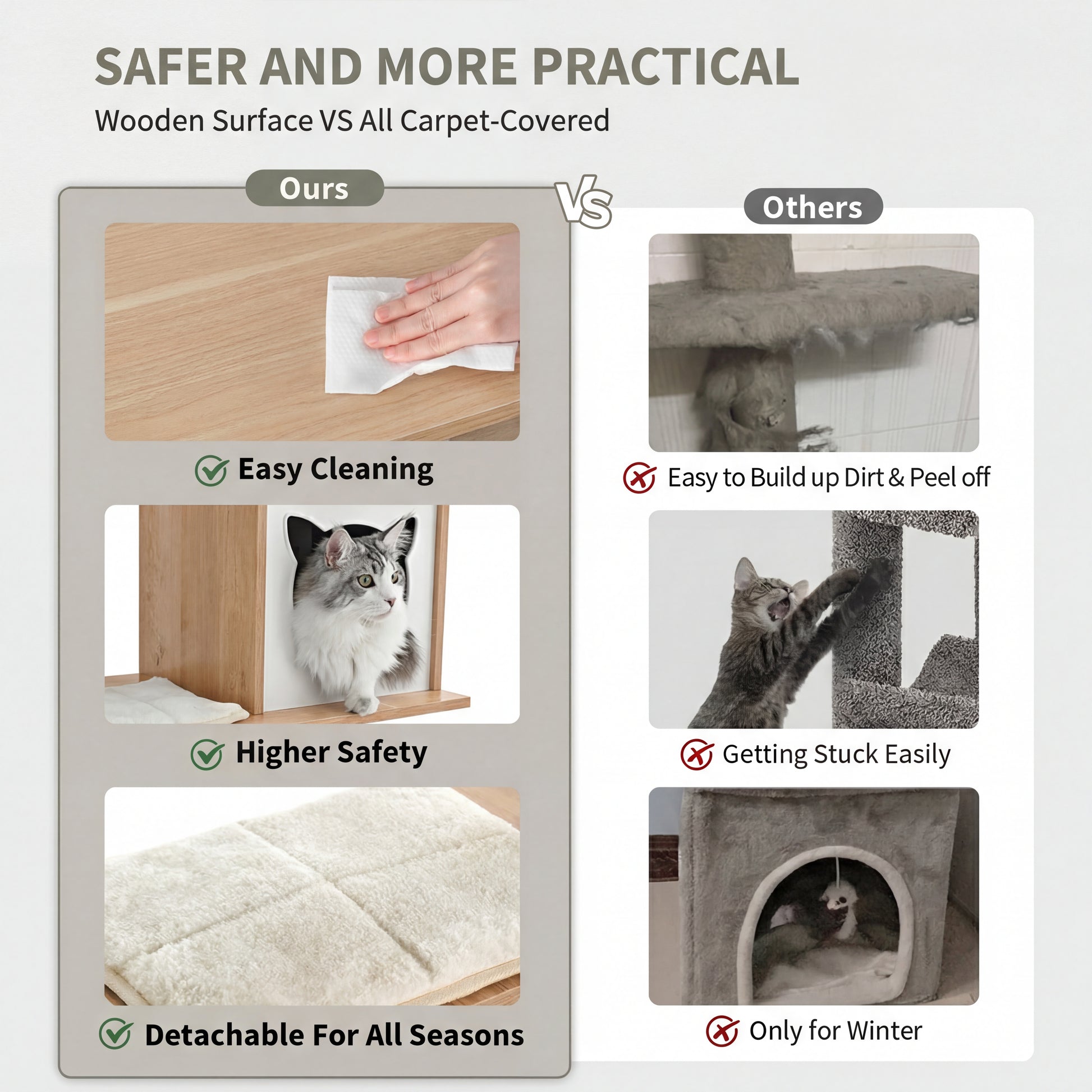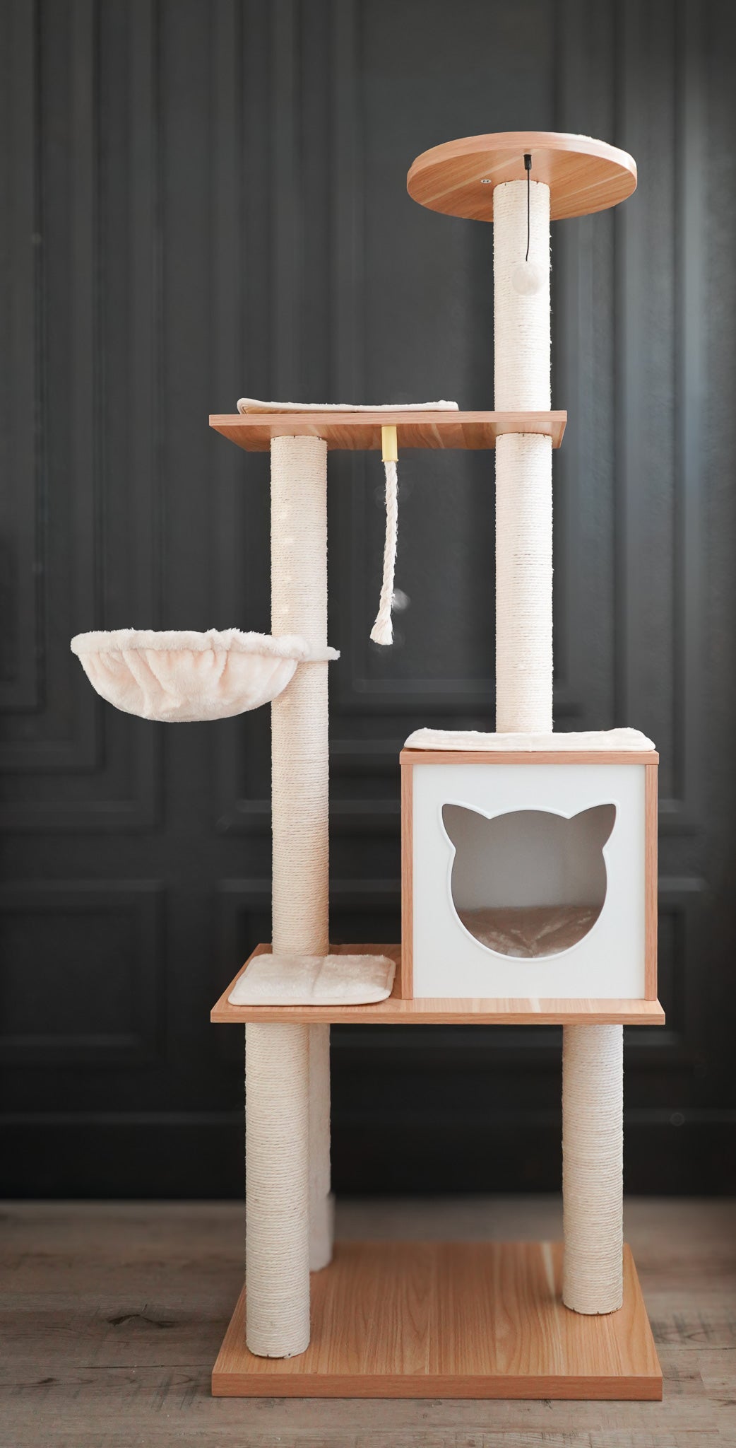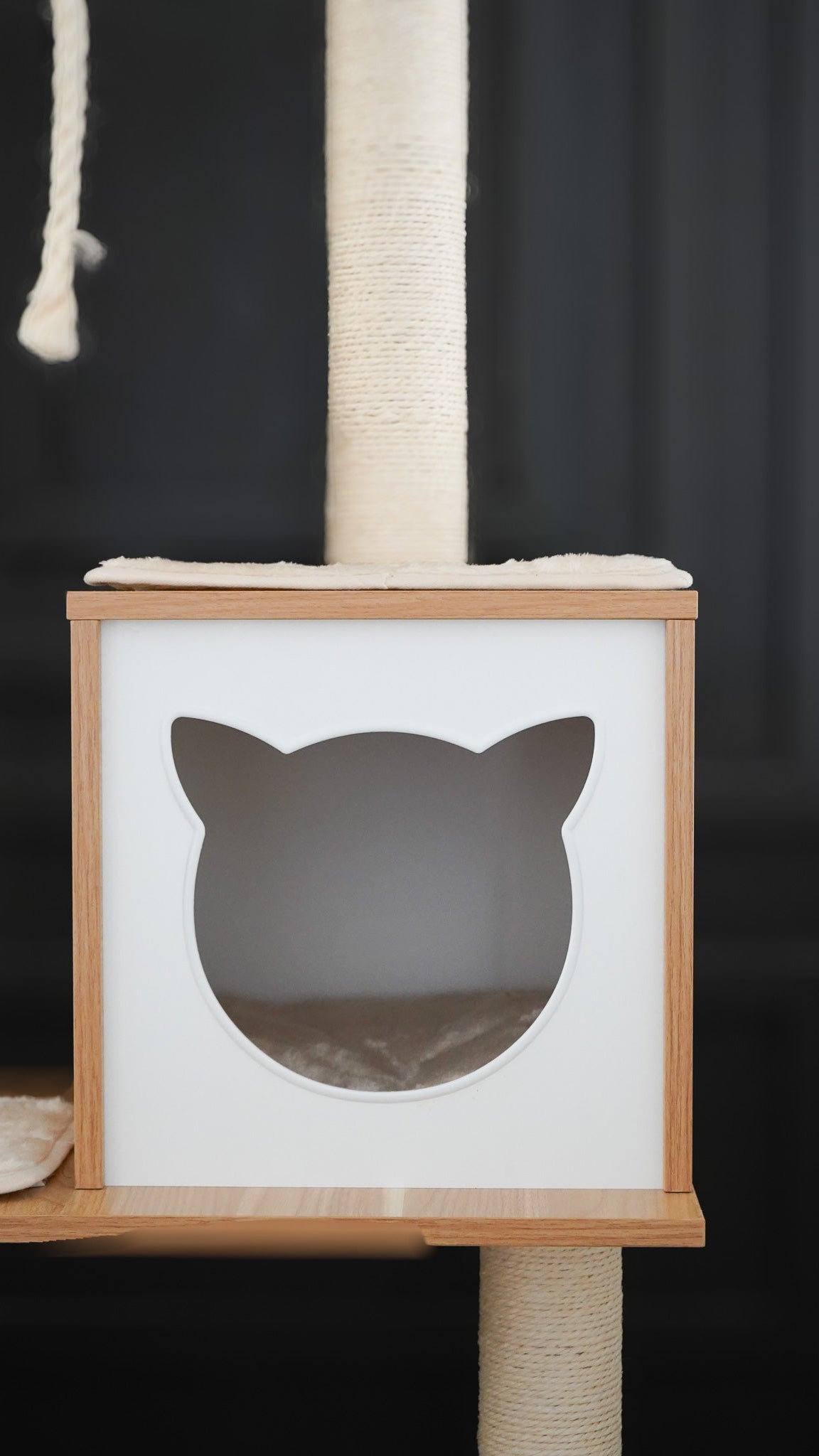 A modern, space-efficient cat tree designed for climbing, lounging, and daily scratching. Built with a solid wood frame, removable scratch pads, and multiple resting areas, it supports natural cat behavior while fitting seamlessly into real homes.